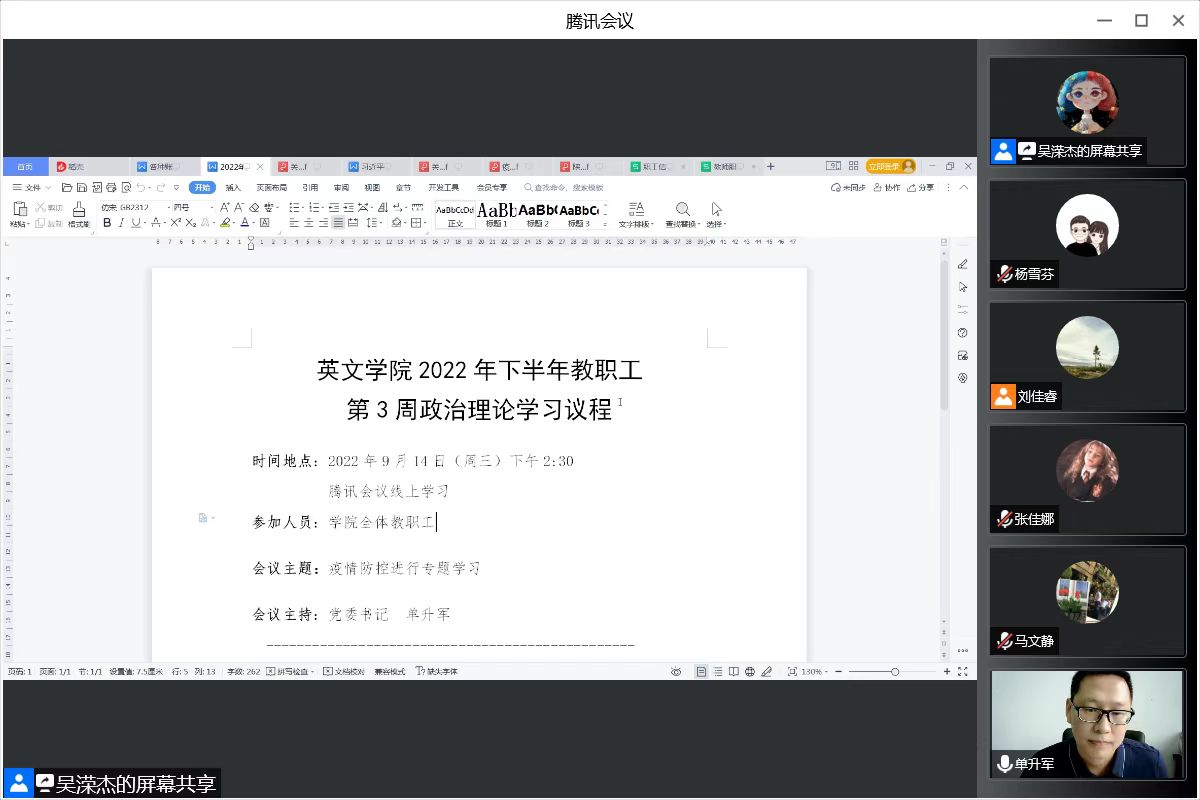 2022年9月14日下午,太阳成集团官网通过腾讯会议召开本学期第3周政治理论学习会,就疫情防控工作进行传达、学习、部署,学院全体教职工参加,会议由党委书记单升军主持。