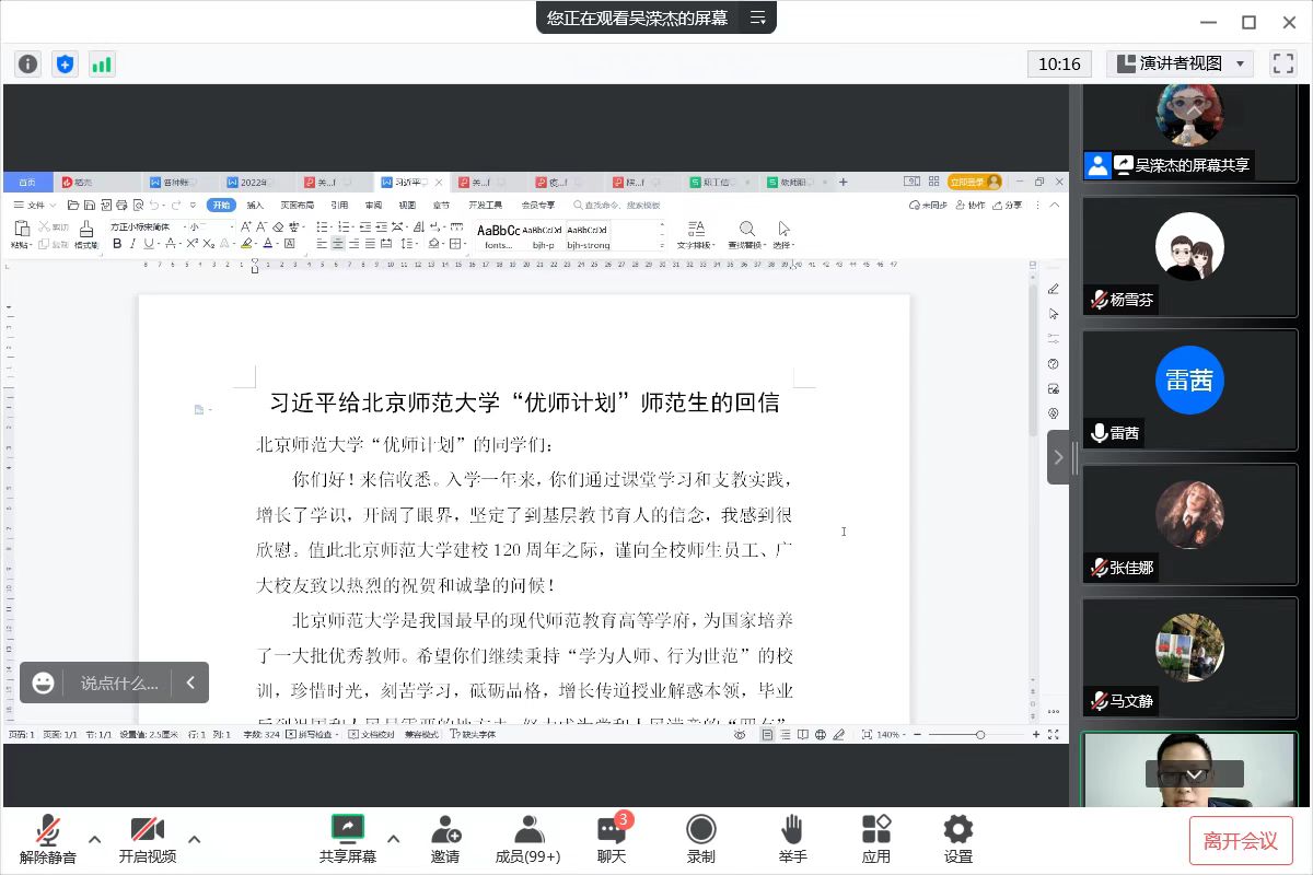会上,单升军宣读了学校党委关于徐斌挂职学院副院长的通知及班子成员分工调整情况。新进教师贾宏涛博士领学了《习近平总书记给北京师范大学“优师计划”师范生的回信》,一同回顾习近平总书记十八大以来给高校师生历次回信精神。党委副书记马文静传达了学校党委《关于在全校开展纪律教育学习宣传月活动的通知》,此次活动以“严守纪律规矩 加强作风建设”为主题,需组织一次集体学习、进行一次党规党纪知识测试、开展一次警示教育活动、召开一次专题组织生活会等四项活动内容。综合办公室主任张佳娜宣读了学校《疫情防控工作检查问题通报》。